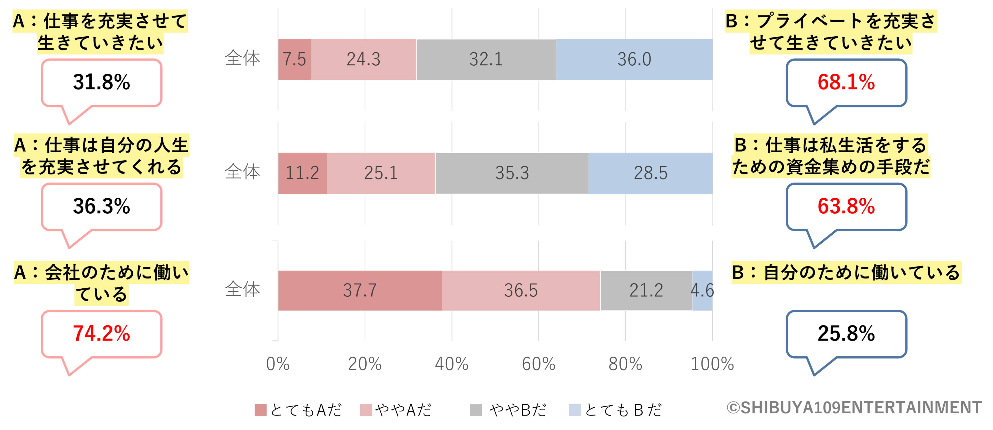 仕事の価値観について※図10の回答も、「仕事の充実」よりも「プライベートを充実させて生きていきたい」と回答したのが68.1%、「仕事で人生を充実させる」よりも「仕事は私生活をするための資金集めの手段だ」と考えているのが63.8%、働くのは「自分のため」というよりも「会社のために働いている」と考えているのが74.2%となりました。