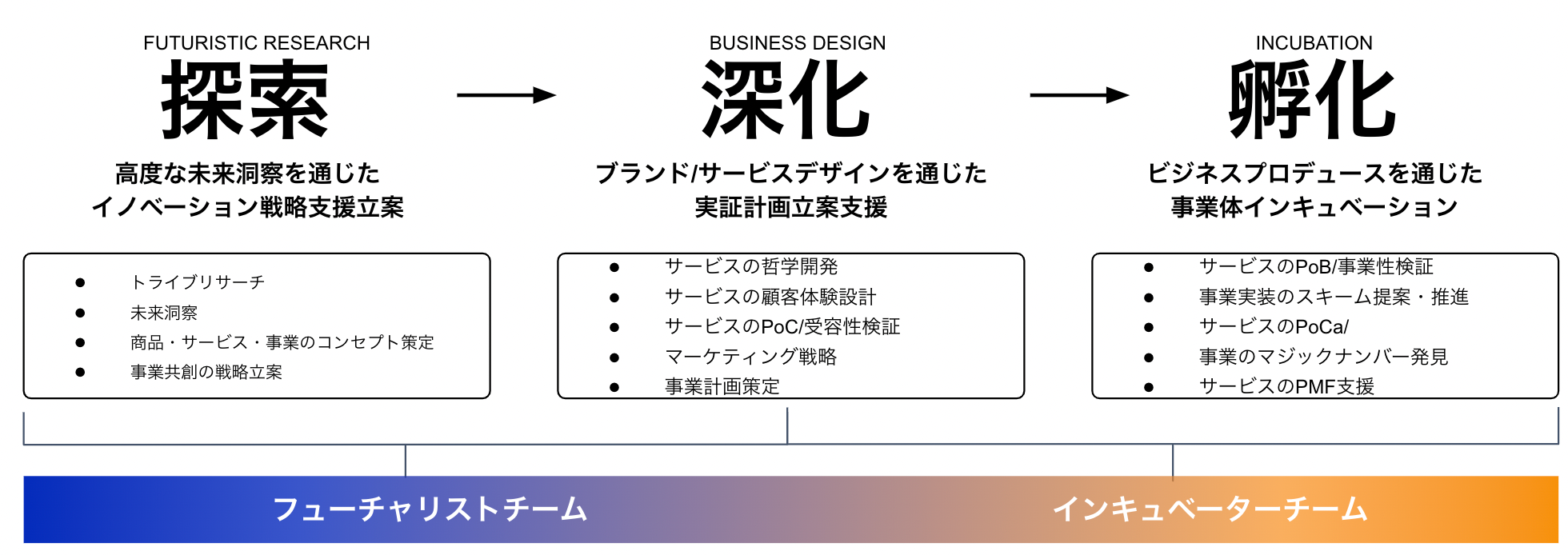 探索部門調査結果をもとに、ブランド/サービスデザインを通じた実証・事業計画策定を行います。