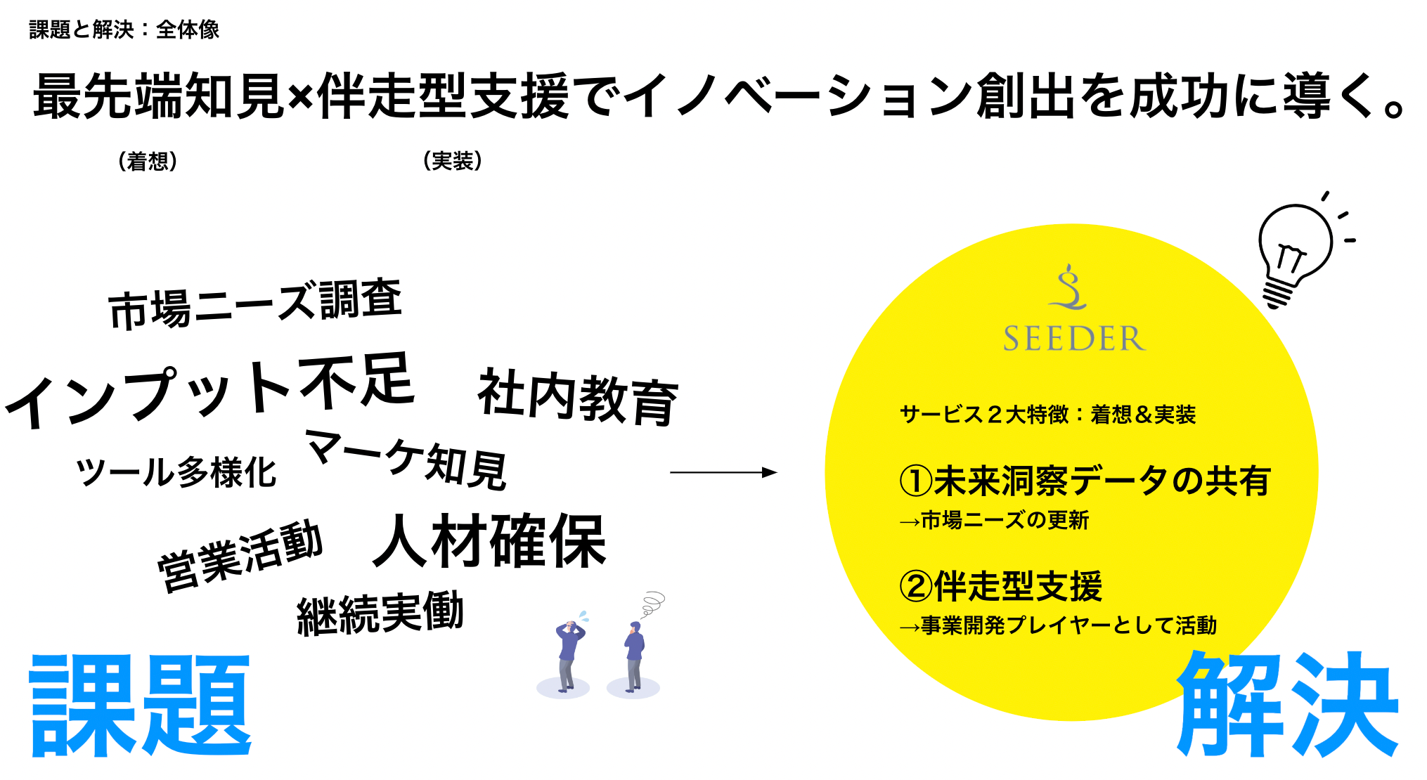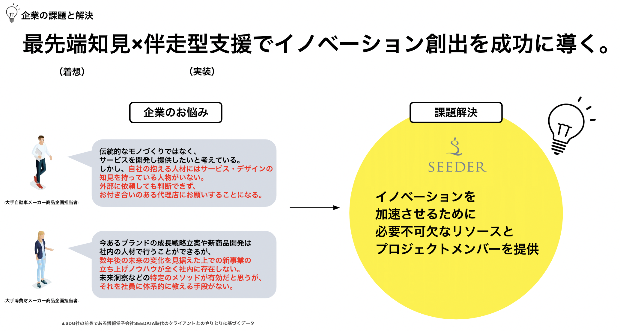 そして、あらためて、イノベーションの兆しを具現化する「人」を中心に捉えたときに、「種を蒔く人」にフォーカスした「SEEDER(シーダー)」を社名としました。