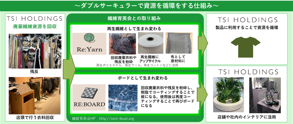 TSIは廃棄物を極力出さない循環型事業モデルの実現を目指しており、ファッションロスゼロに向けた取組みを推進しております。着なくなった古い洋服や残反をリサイクルコットンやボード材の“資源”として循環させる「ダブルサーキュラー」の仕組みを構築し、運用しています。