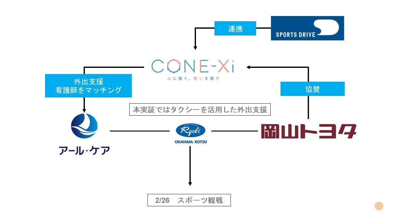 本フェーズでは、岡山トヨタ、sports drive、株式会社アール・ケア(以下、アールケア)、岡山交通株式会社(以下、岡山交通社)との協業事業となります。全国各地での実証が可能となり、他県での展開も視野に入れた取り組みとなります。