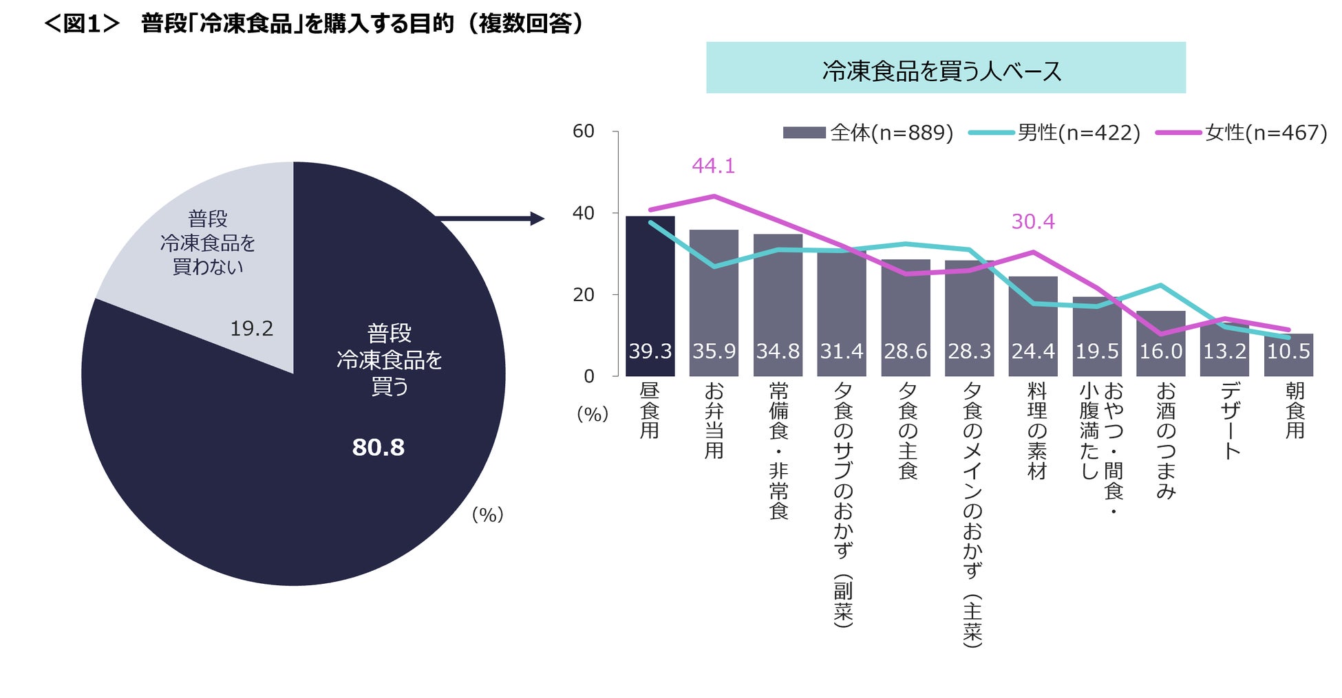 普段、冷凍食品を買う人は80.8%。目的は「昼食用」が39.3%とTOP。<図1>