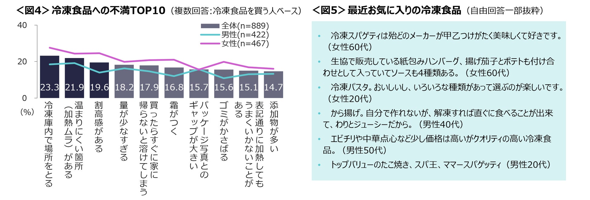 冷凍食品に感じる不満は、「冷凍庫内で場所をとる」「温まりにくい箇所がある」「割高感がある」。<図4>