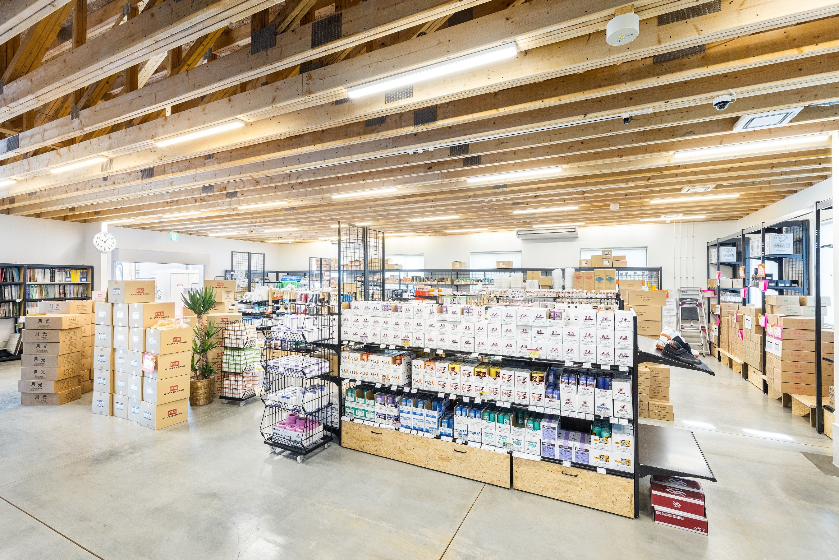 この店舗販売事業をさらに拡大し、規模もサービスも海外レベルのペイントショップを目指すべく、新社屋建設を機に実店舗の拡充を計画。昨年5月に着工した木造2階建て、延べ床面積700㎡の新社屋は12月に竣工。1階の店舗200㎡は柱のないフロアレイアウトを実現。入口から店舗全体を一望できる解放感と、木造トラスの小屋組みをあらわにしたオシャレな空間で、まさに、海外のペイントショップを体現。今までの建材店やホームセンターにはない、専門店ならではのサービスで、”魅力あふれるショッピング”を楽しめる場所として2023年1月にオープンしました。