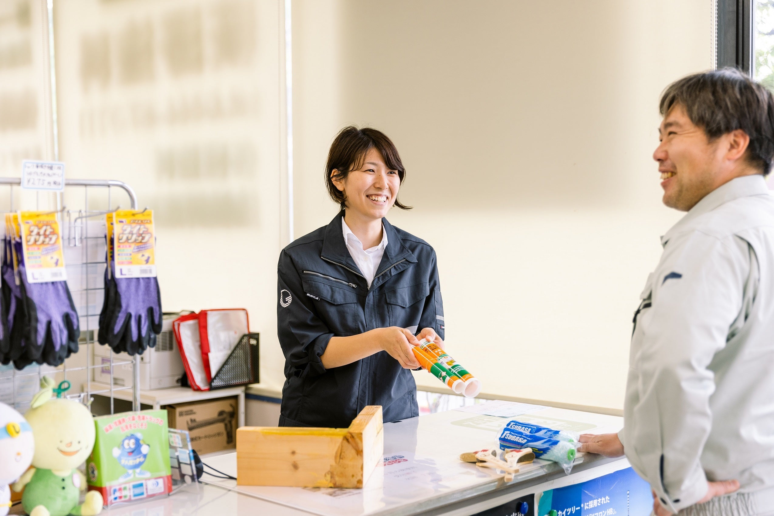 当店の強みは店頭におかえる高度な接客スキル。プロの塗装職人を相手に30年以上にわたって磨いてきた接客力を発揮して、お客様の”困った”に寄り添う、かゆいところに手が届く応対で、ショッピングをサポート。店長は”現場”に精通した営業部門のトップ。専門スタッフ、建築系専門学校卒の新入社員を含めた計5名で新店舗を運営。プロの塗装ユーザーはもちろんのこと、大工、板金、外構など多種多様な業種、職種の方々の需要も取り込み、塗料にそれほど詳しくないお客様や地域の一般客も目的にあった買い物が気軽にできる店を目指していく。