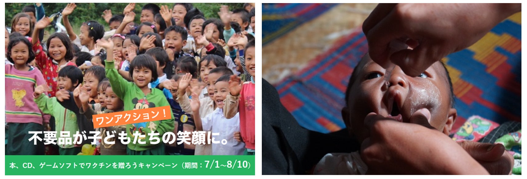 また、買取金額+10%がJCVに寄付され、感染症を予防するためのワクチンなどが途上国の子どもたちに贈られます。ポリオやBCG(結核)ワクチンはわずか約20円、単行本10冊(約200円)で、10人分のワクチン支援につながり、子どもたちの命を守ることができます。