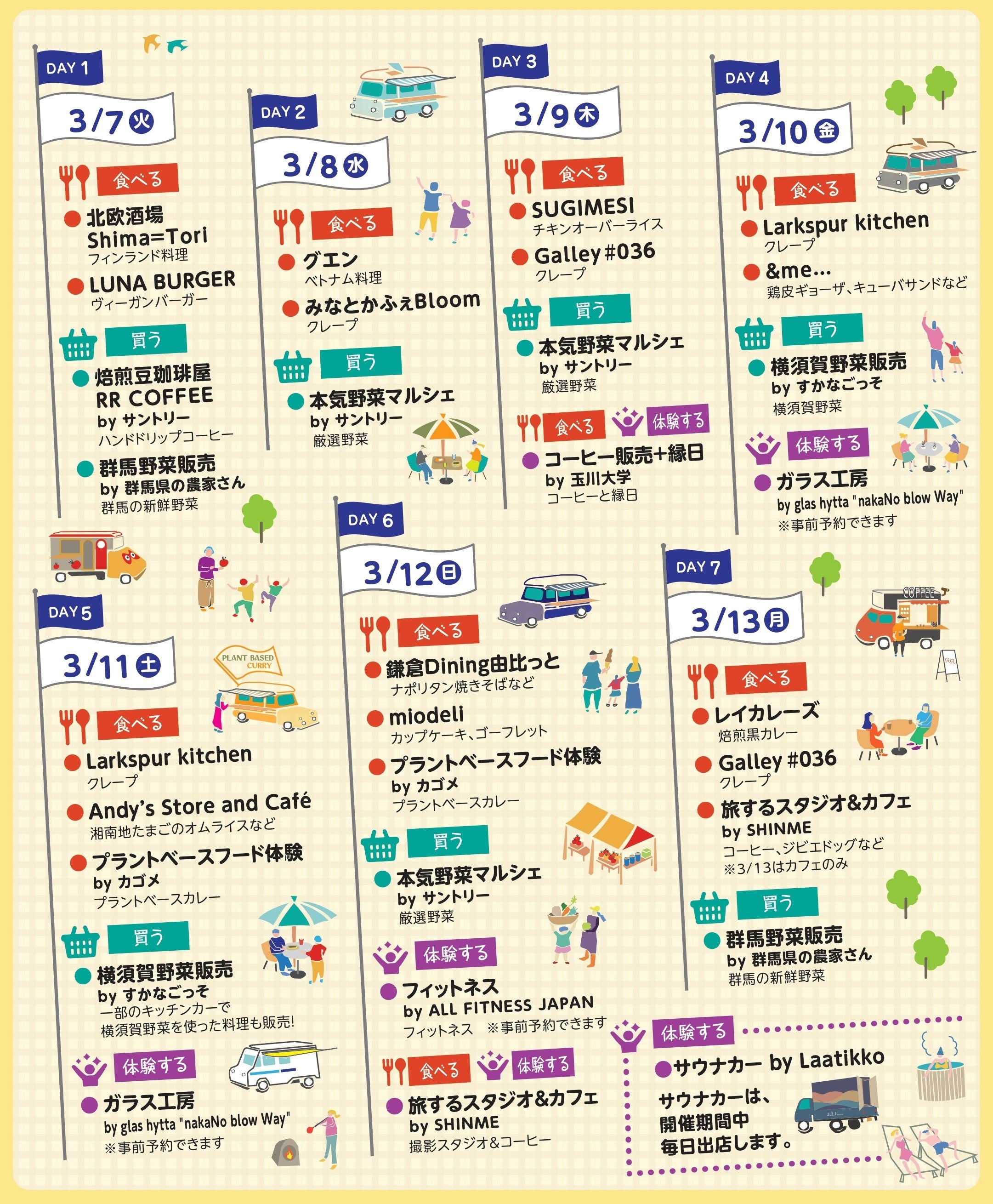 ○内容:キッチンカーが1日2〜3台出店するほか、カゴメ株式会社の体験型プロモーション、一般社団法人ALL FITNESS JAPANの出張型屋外フィットネス、JAよこすか葉山農産物直売所「すかなごっそ」の野菜販売、玉川大学観光学部の学生が企画するキッチンカーが出店します。