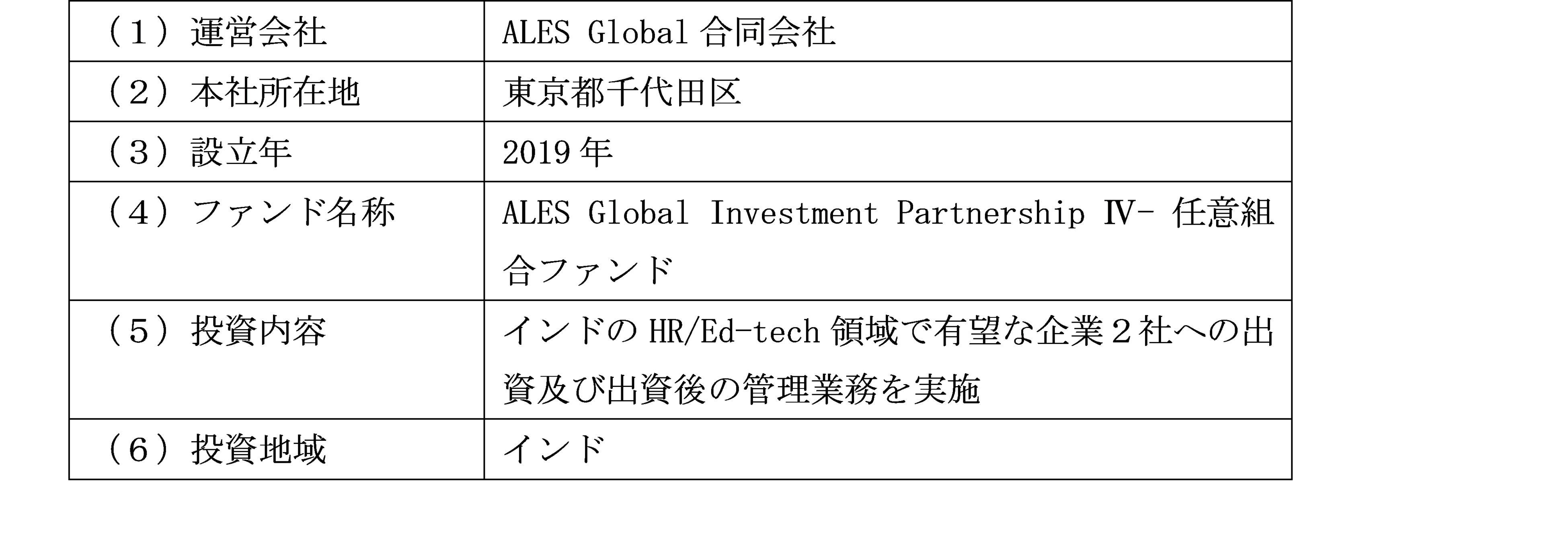 当社は、ALES Global合同会社(以下、「ALES Global社」という。)が運営する「ALES Global Investment Partnership Ⅳ- 任意組合ファンド」へ出資を行いましたので、お知らせいたします。