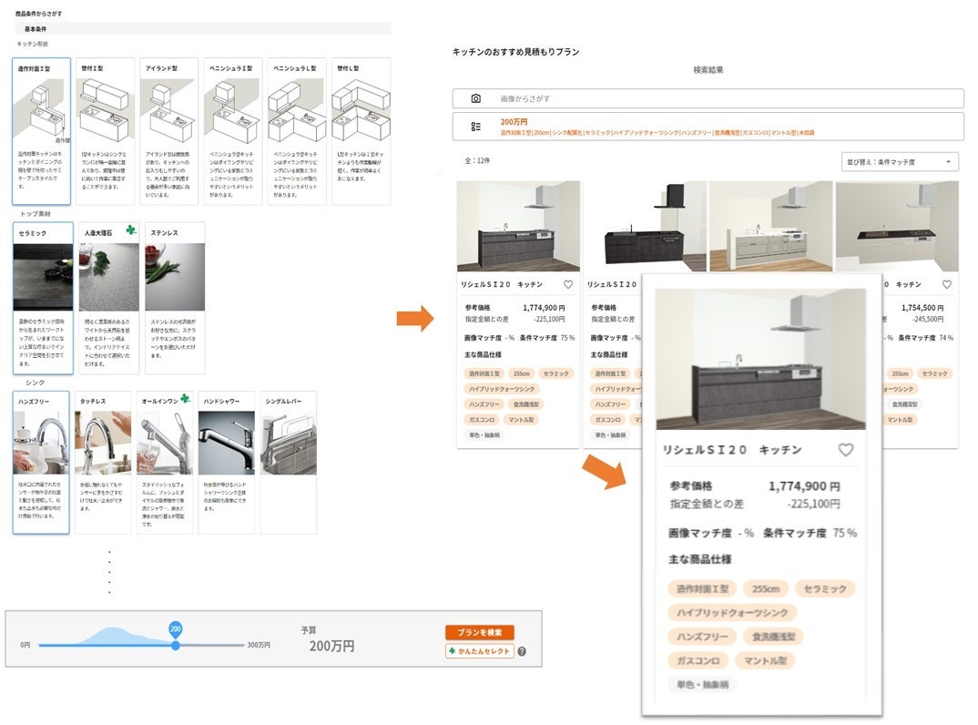 「LIXIL商品プランレコメンドシステム」は、お客さまご自身で、簡単な予算・条件やイメージ画像から、好みに合ったLIXILのおすすめの水まわり商品*の見積もりプラン(仕様と参考価格*)をご提案するデジタルサービスです。AI技術(画像認識AI・機械学習AI)とLIXILの見積もりシステムのデータをかけ合わせたLIXIL独自の仕組みです。(特許出願中)