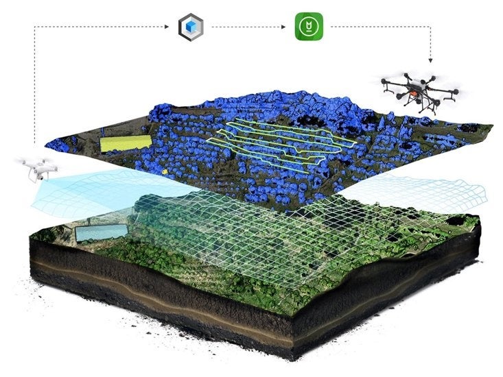 3D飛行ルート計画により、過去の課題であった厳しい地形条件下での航行は、今は問題ではありません。測量用ドローンを使用して対象区域をスキャンしマッピングできるため、その圃場のあらゆる起伏を識別することが可能です。果樹園モードでは、木々のそれぞれの形を識別し、それを元に生成された3D飛行ルートにより、Agras Tシリーズ を使って効率的に噴霧を実施することができます。