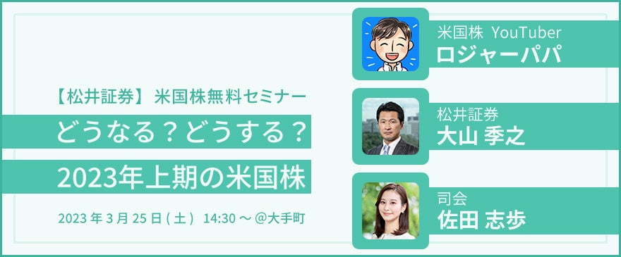 当セミナーでは、「米国株には興味あるけど、あまり知識がなくて…」という方や、「今米国株はどんな状態で、今後はどうすればよいの?」という不安をお持ちの方にもご満足いただけるよう、登録者数11万人超の人気米国株YouTuberロジャーパパさんにご登壇いただき、米国株情報収集の仕方や、2023年上期の米国株おすすめ株式&ETFについてお話いただきます。また、当社マーケットアナリストの大山季之からも、マクロとミクロ両面から今後の米国株についてお話いたします。