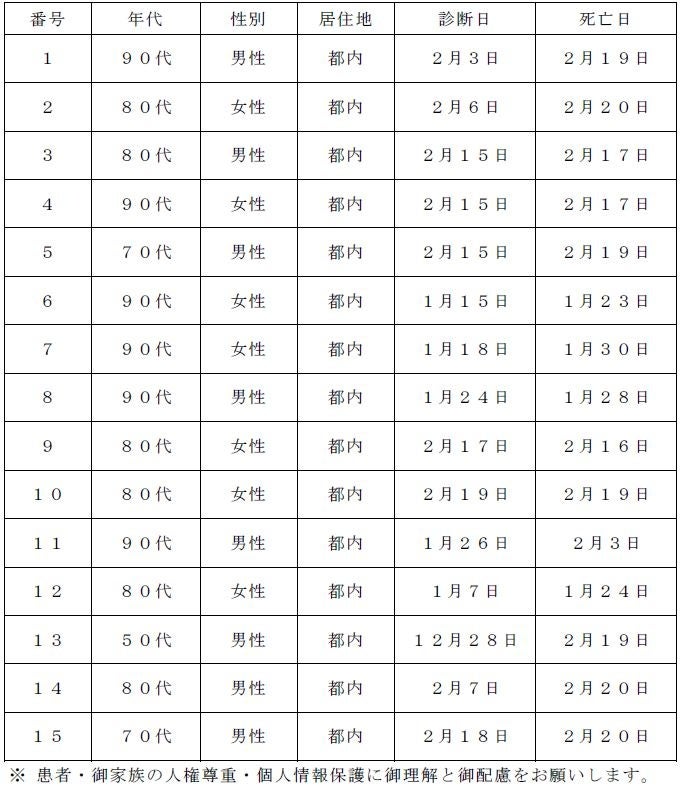 新型コロナウイルスに関連した患者の死亡について business Twitter Facebook はてブ Pocket LINE コピー 2023.02.22 この記事は約1分で読めます。 都内で新型コロナウイルスに感染した方が死亡されましたのでお知らせします。 お亡くなりになった方のご冥福をお祈り申し上げます。 1 新型コロナウイルスに関連した死亡者(本日公表分) 2 新型コロナウイルスに関連した死亡者の累計 7,929人