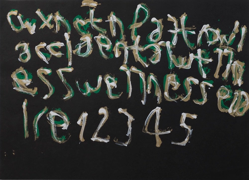 1998年生まれ。滋賀県在住。2017年から『やまなみ工房』に所属 元々は紙を切って大好きな扇風機のプロペラ作っては眺めることが好きだった彼だが、職員の書く字を真似たり、窓に指で文字をなぞられたりする様子から、英字新聞をお渡しすると画用紙に模写されたことが絵画に取り組まれるきっかけとなった。英字の他数字の作品も多く、描かれるときは、一切の迷いや躊躇は無く、あっという間に描き終えられ、勢いや力強さが英字や数字の書体にも表れている。文字は色を変えて筆やペン、時には指を用いて何度も上からなぞられることが多く、より作品に深みをもたらしている。最近は文字だけでなく、人物や自分の好きなものを絵にされる作品も生まれ、クールな作風と合わせて彼独特の感性が作品にも反映されている。