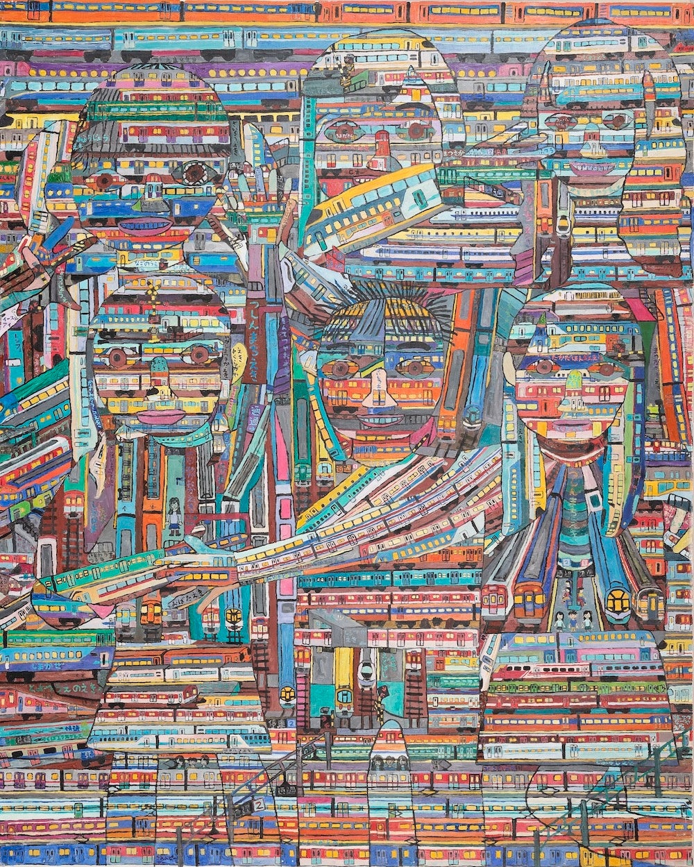 時に独特の不思議なメロディーの歌を口ずさみながら力強く作画される国保さん。彼の描く絵はもちろん、その不思議な、ちょっぴり哀愁漂うメロディーにも心惹かれてしまう。オイルパステルやアクリル絵具を大胆に使い、描いては上描きを繰り返すので何層にも重なった絵はずっしりとした重みがある。
