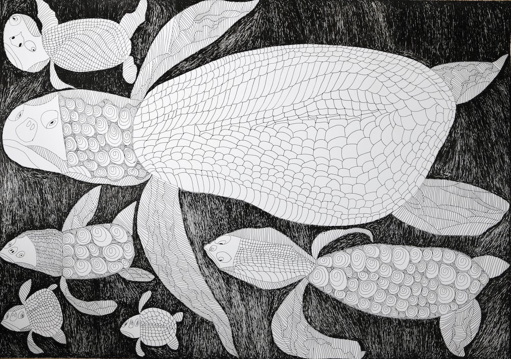 強い筆圧でぐいぐい。キュニキュニと呼ばれる独特の楔型模様を編み出した。そのため、絵には奥行、立体感が生まれる。絵の題材は動物から静物画まで様々だが、どの作品も彼独特の画風で異彩を放っている。作品は国内外で評価されるが、本人は外界の雑音には無頓着。
