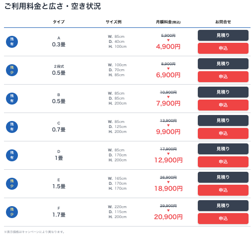 - 部屋タイプとサイズ、月額料金はこちら