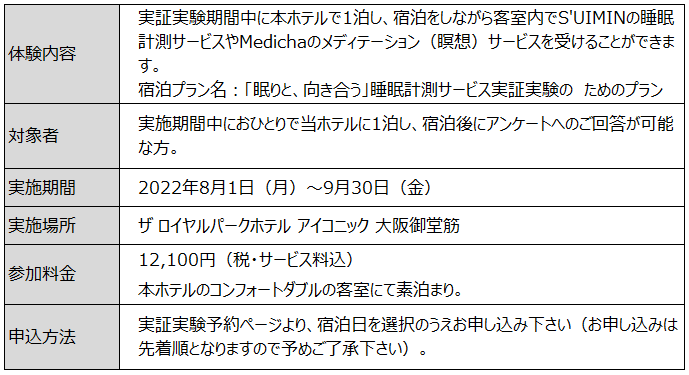 ■今回の実証実験は、今後のサービス化を見据えた最初の実証実験として始めるとともに、従来利用者が自宅で行っていた脳波による睡眠計測を、旅ナカの宿泊施設で容易に体験できるサービスとして作り変えたプランを導入します。