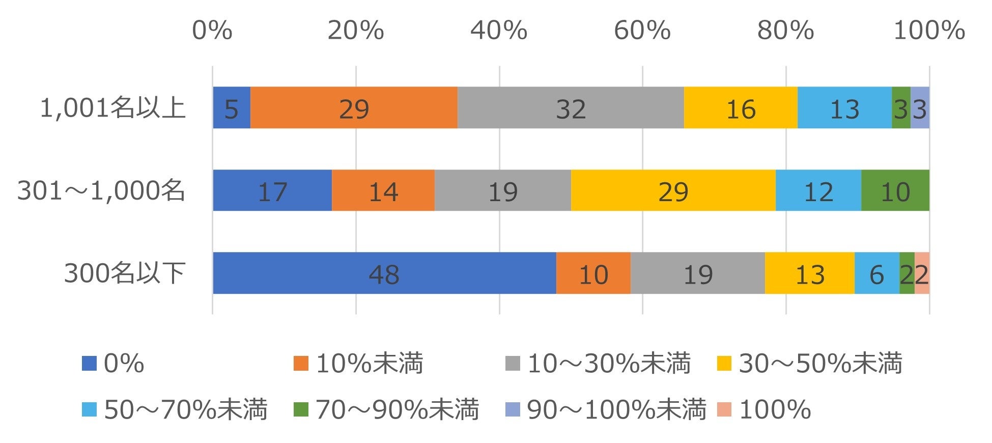 2022年12月時点における内定辞退率を見てみると、大企業では「10~30%未満」が最多で32%、次いで「10%未満」(0%を除く)で29%などとなっており、内定辞退率「30%以上」(「30~50%未満」~「100%」の合計、以下同じ)の企業の割合は34%と3割程度に上っている。また、「0%」とする割合は僅か5%で、内定者数も多いだけに多少の内定辞退は避けられない状況がうかがえる。中堅企業における内定辞退率「30%以上」の割合は50%に上っており、大企業より高い割合となっている。一方、中小企業では48%と約半数は内定辞退率「0%」で、内定者の取りこぼしが少ない傾向となっている。