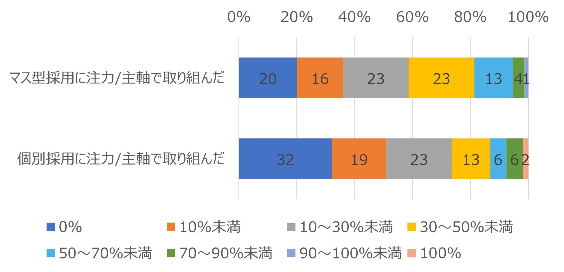 取り組んだ採用手法別に2023年新卒採用の内定辞退率を見ると、「マス型採用に注力/主軸で取り組んだ」とする企業群より「個別採用に注力/主軸で取り組んだ」とする企業群の方が、内定辞退率は低いという傾向が見られる。「0~10%未満」(「0%」と「10%未満」の合計)の割合は、「マス型採用に注力/主軸で取り組んだ」とする企業群で36%に対して、「個別採用に注力/主軸で取り組んだ」とする企業群では51%と15ポイント高くなっている(図表4-2)。この結果より、個別採用への積極的な取り組みは、内定者の入社意欲を高める働きがあり内定辞退率を抑制するカギとなっていることが推測される。