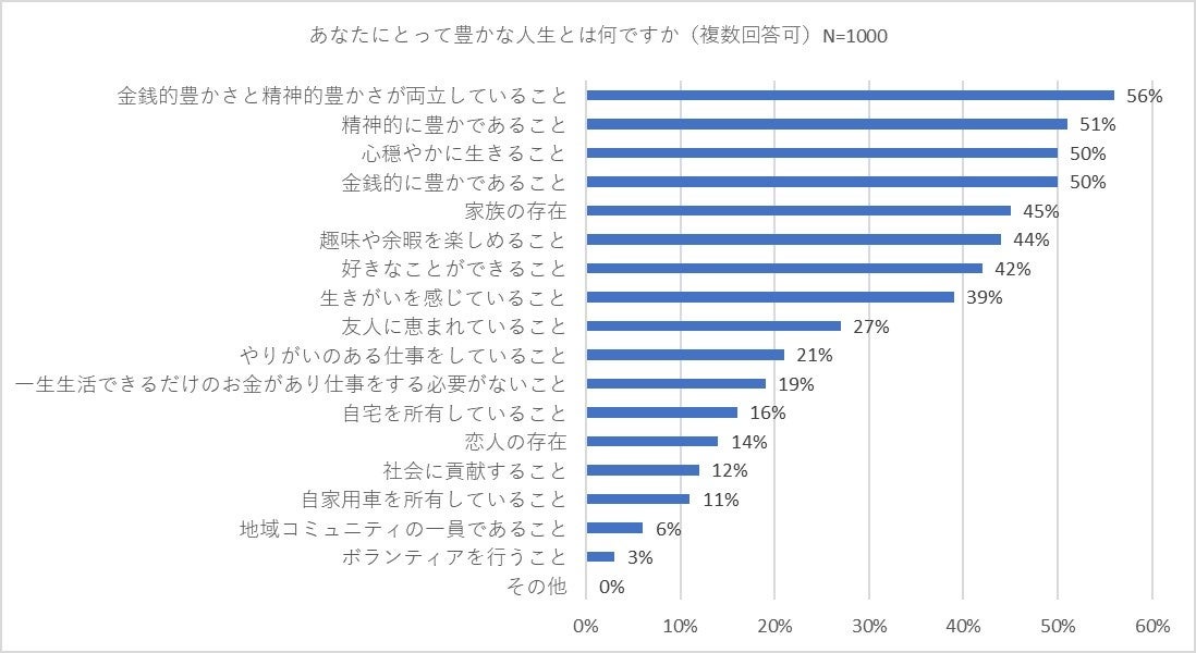 30~40代の働き盛り世代の男女1,000人に「あなたにとって豊かな人生とは何ですか」(複数回答可)と質問しました。その結果、「金銭的豊かさと精神的豊かさが両立していること」が56パーセントでトップ。2位~3位はほぼ同じ割合で「精神的に豊かであること」(51パーセント)、「心穏やかに生きること」(50パーセント)、「金銭的に豊かであること」(50パーセント)が続きました。