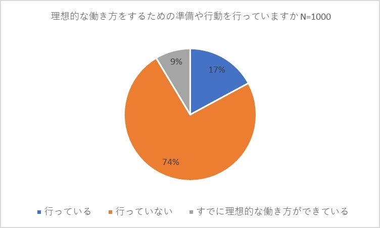 それでは、回答者の皆さんは理想的な働き方を実現するために具体的な準備や行動を行っているのでしょうか。「行っている」と答えた人は17パーセントで、「行っていない」との回答が74パーセントと多数を占めました。また、9パーセントの方は「すでに理想的な働き方ができている」と回答しています。
