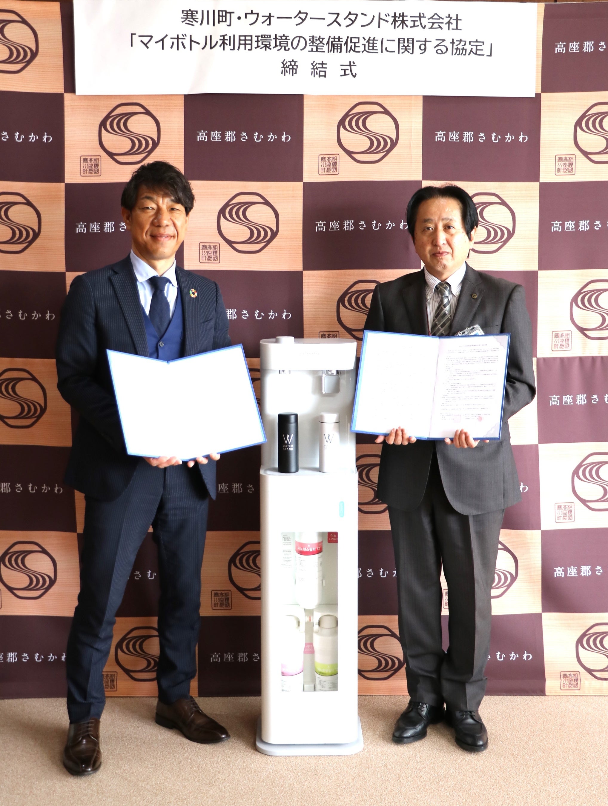 ▲(右より)寒川町副町長 畑村正樹様、ウォータースタンド株式会社常務取締役営業部長 近藤紀行