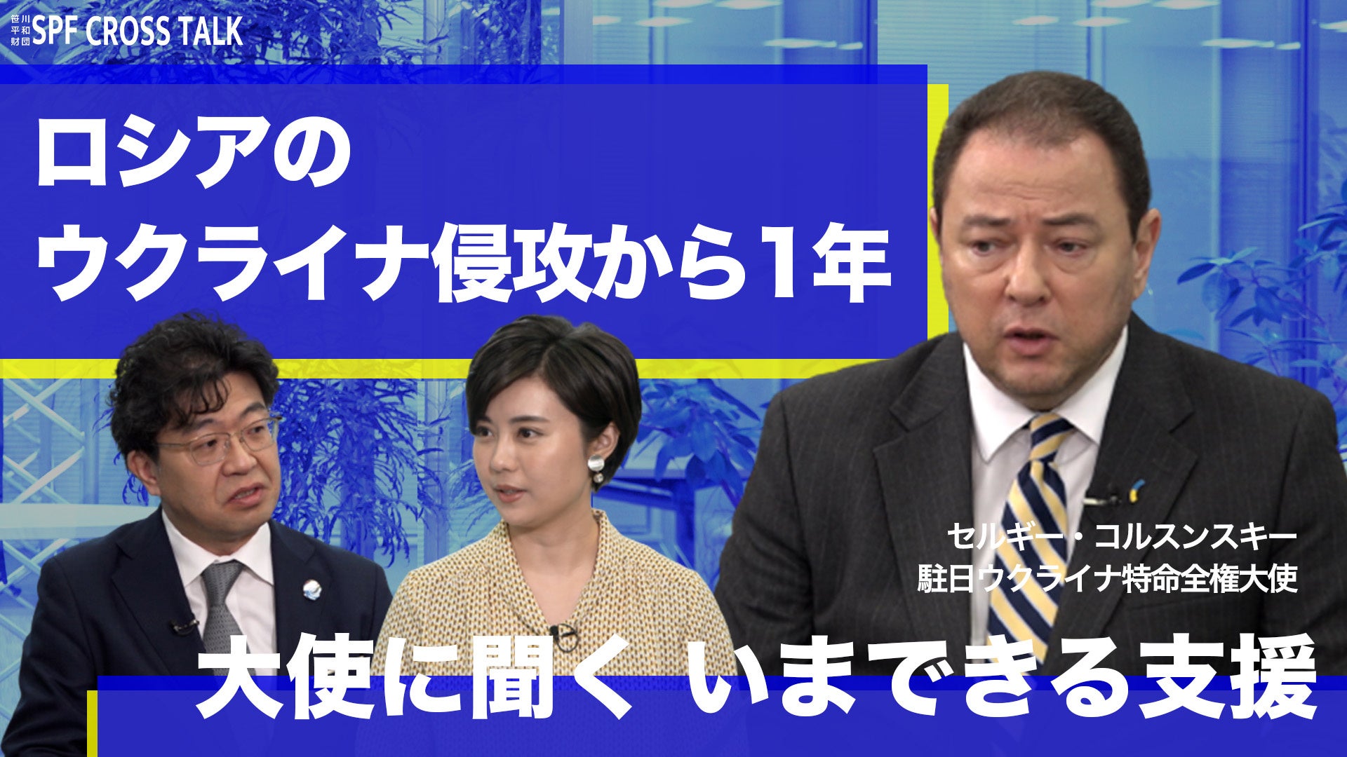 笹川平和財団(東京都港区、理事長・角南篤)は、YouTube番組「SPF CROSSTALK」の第4弾を2月24日(金)より公開しました。今回のテーマは「ウクライナ情勢」。セルギー・コルスンスキー駐日ウクライナ特命全権大使をお招きし、ロシアによるウクライナ侵攻からの1年を振り返ってもらうとともに、日本政府や、日本財団・笹川平和財団が行ってきた避難民への支援についての思い、今後、日本に期待することなどをお話いただきました。