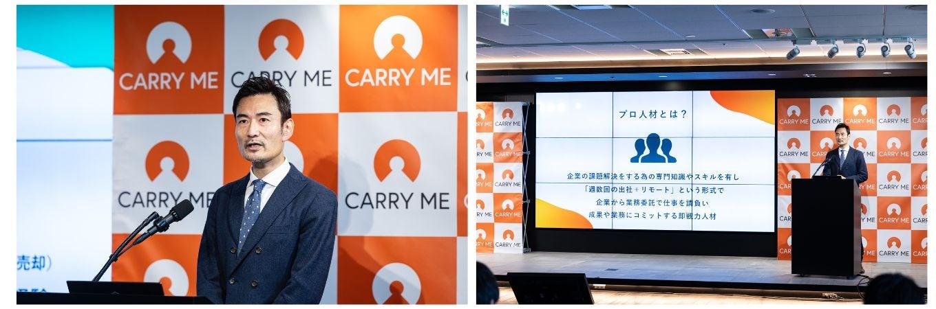 な企業において経験やスキルを培った「外部人材」の登用が注目を浴びています。個人の働き方としてもフリーランス人口(副業を含む)は1,550万人までに突破し、「転職」ではなく、経験とスキルのある「即戦力人材」としての働き方が増えています。しかし、実際にはフリーランスを活用できている企業はわずか3割に留まっている現状です。今後、キャリーミーではプロ人材と企業の「機会損失」の課題を解決し、プロ人材という働き方をより日本に広めるべく、邁進していきます。」と話しました。