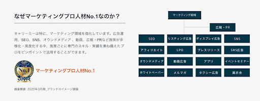 また、キャリーミーが強みとするマーケティング領域については「マーケティング領域がデジタルやSNSの登場により、業務内容が高スキル化・細分化している。すべての施策を戦略から実務までカバーできる人材はほぼおらず、その為、企業側もピンポイントでその課題を解決してくれる専門性の高いプロ人材を求めるようになってきている」と、正社員採用ではなく、なぜ企業がプロ人材を雇用するかという点について考えを述べています。