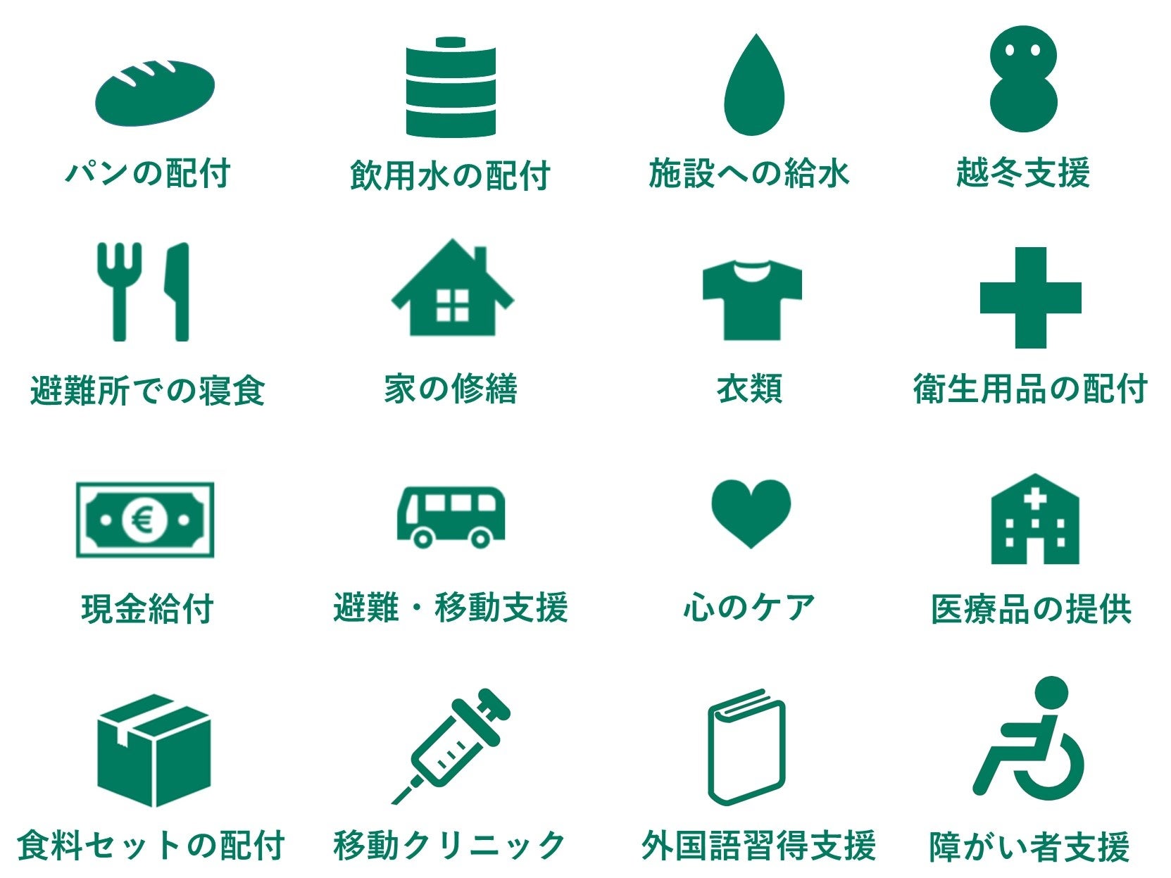 ウクライナおよび近隣諸国での活動は、人道支援物資の輸送、食料や衛生用品・医薬品の配布、避難支援、給水、宿泊施設、基本的なシェルターの再建、暖房やエネルギー供給による越冬支援、心理的ソーシャルサポートやメンタルヘルス、女性や子どもの保護、障がい者、国外避難者と国内避難民の医療検査、法律相談、外国語講座、アートセラピー、子どもの教育支援、ウクライナの病院や難民センターへの医療機器提供など人道支援全般にわたるプログラムになります。