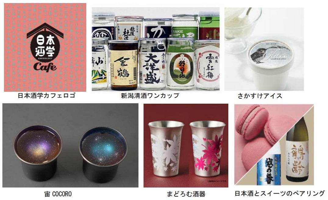 新潟清酒(小容量サイズ)や日本酒とともに楽しめる県産酒器やスイーツ、日本 酒関連書籍やグッズの販売、タイプの異なる日本酒の利き酒体験、日本酒とスイーツのペアリング体験、さかすけ(乳酸菌発酵酒粕)アイスの試食等
