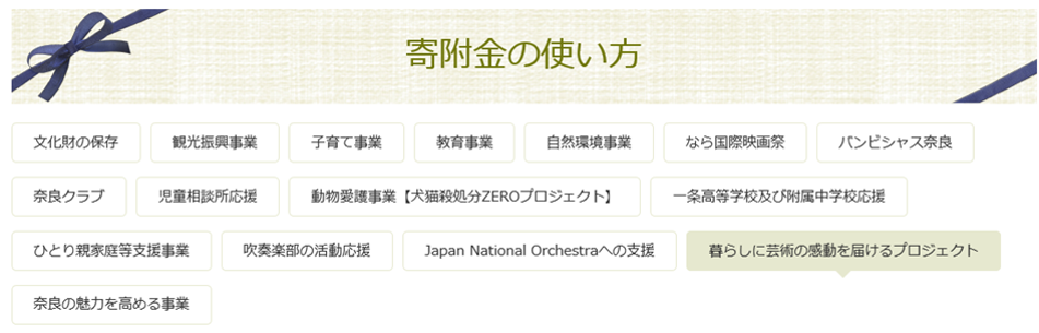奈良市では、市民が文化芸術に触れる機会増やし、市民の暮らしに芸術の感動を届けるため、ふるさと納税寄付金の使途に、文化・芸術への支援を盛り込んでいます。