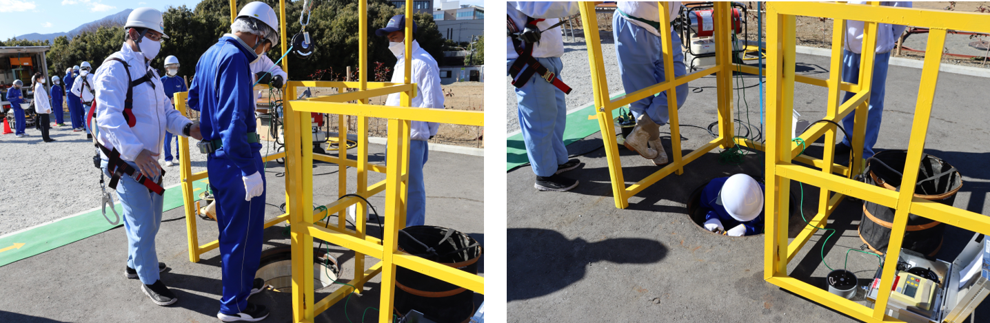 ※入孔時には安全柵やカラーコーンを設置、体験者はヘルメットや安全帯を装着し、作業員監視のもと適切な環境下で安全に実施しました。