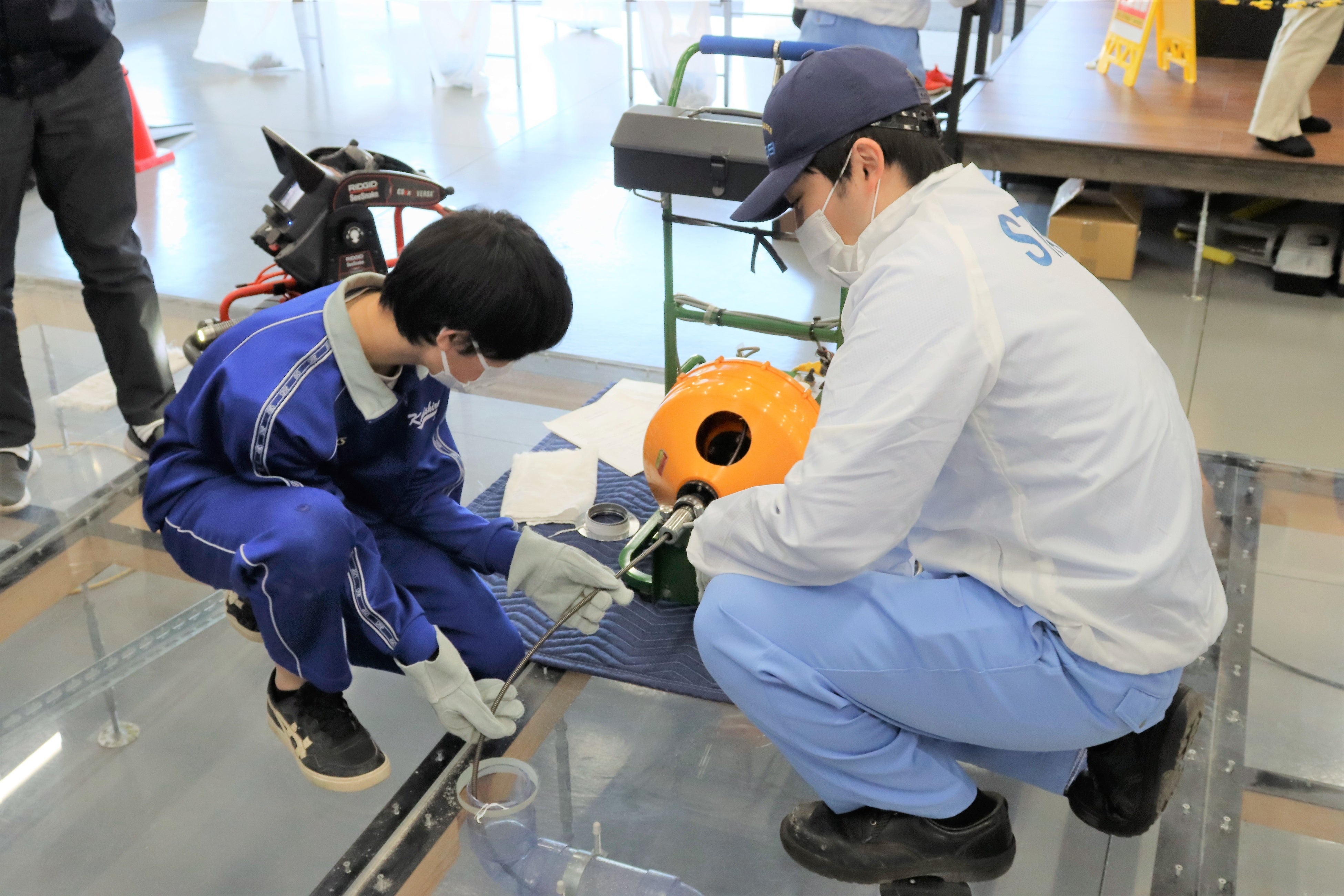 透明の配管を使って実際に流れる下水の流れ見学したり、配管のつまりにおける調査や清掃機材を実際に体験して学びます。