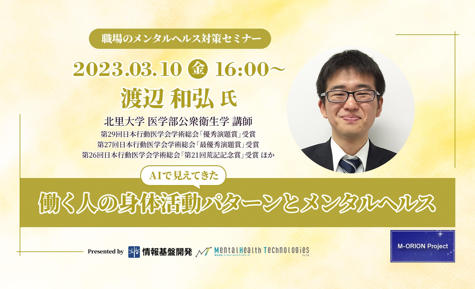 今回のオンラインセミナーでは、北里大学講師・渡辺和弘氏にご登壇いただき、労働者の身体活動を通じたメンタルヘルスの改善について解説いただきます。日々の健康状態のモニタリングと身体活動習慣の維持に役立つ可能性があるとして、当社も参画する産学連携の「M-ORION(エム・オリオン)プロジェクト」の一環で、渡辺氏が開発に携わるAI(深層学習モデル)を活用したアプリケーションについてもご紹介いただく予定です。