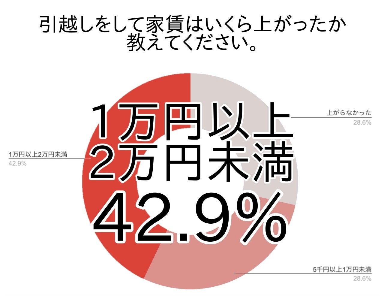 アンケートでは「1万円以上2万円未満」と答えた方が最も多い42.9%でした。半数弱のケースで、家賃が1万円単位で上がるのはやはり大変と感じる方が多いのではないでしょうか。
