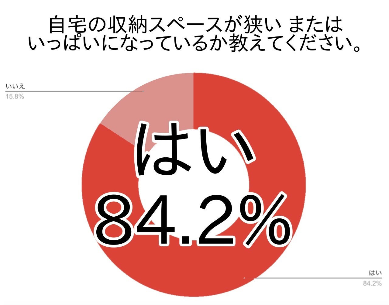 今回のアンケートでは84.2%の方が自宅の収納スペースを狭いと感じる・またはいっぱいになっていると感じていると答えました。