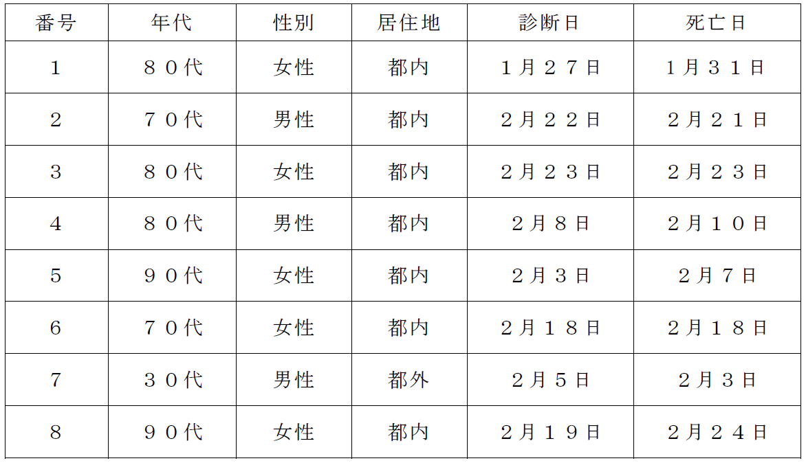 新型コロナウイルスに関連した患者の死亡について business Twitter Facebook はてブ Pocket LINE コピー 2023.02.26 この記事は約1分で読めます。 都内で新型コロナウイルスに感染した方が死亡されましたのでお知らせします。 お亡くなりになった方のご冥福をお祈り申し上げます。 1 新型コロナウイルスに関連した死亡者(本日公表分) ※ 患者・御家族の人権尊重・個人情報保護に御理解と御配慮をお願いします。 2 新型コロナウイルスに関連した死亡者の累計 7,968人