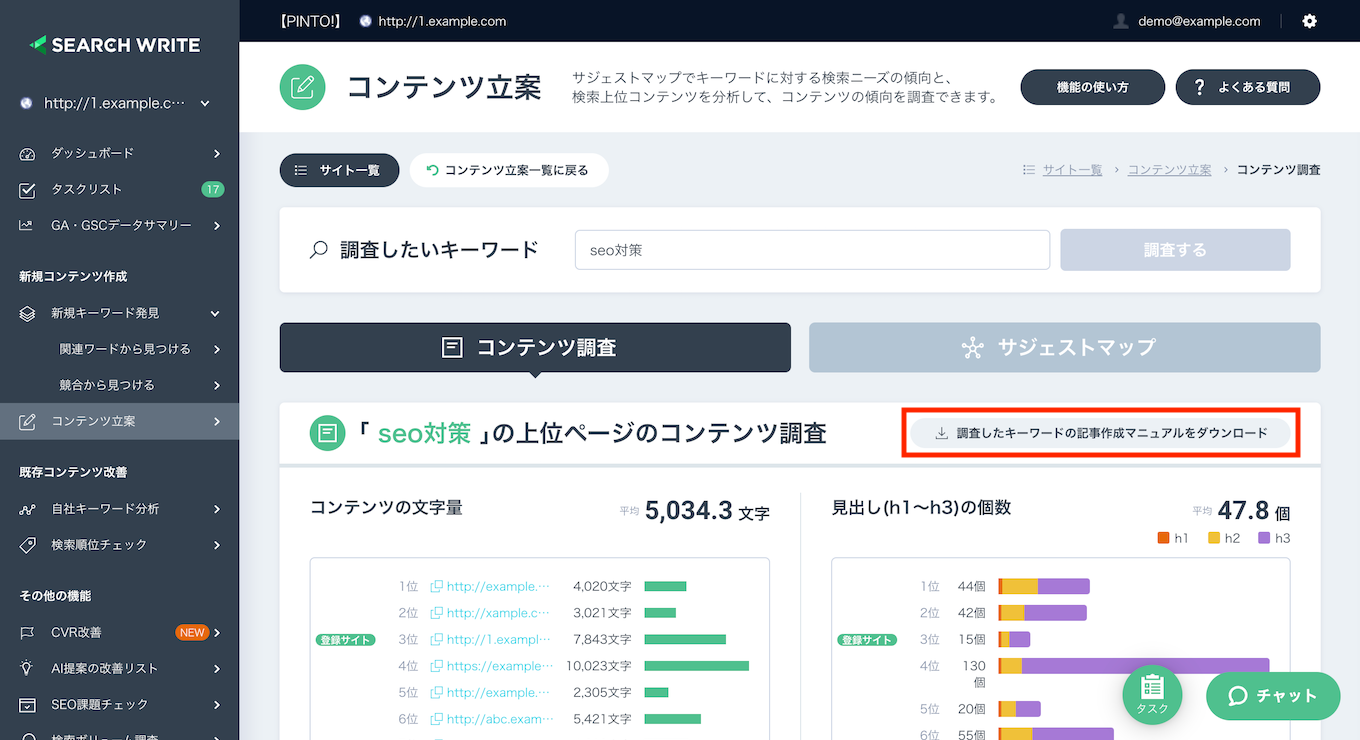 調査したいキーワードを入力すると、そのキーワードの検索上位10コンテンツの構成要素を取得・分析したデータを表示する機能を指します。