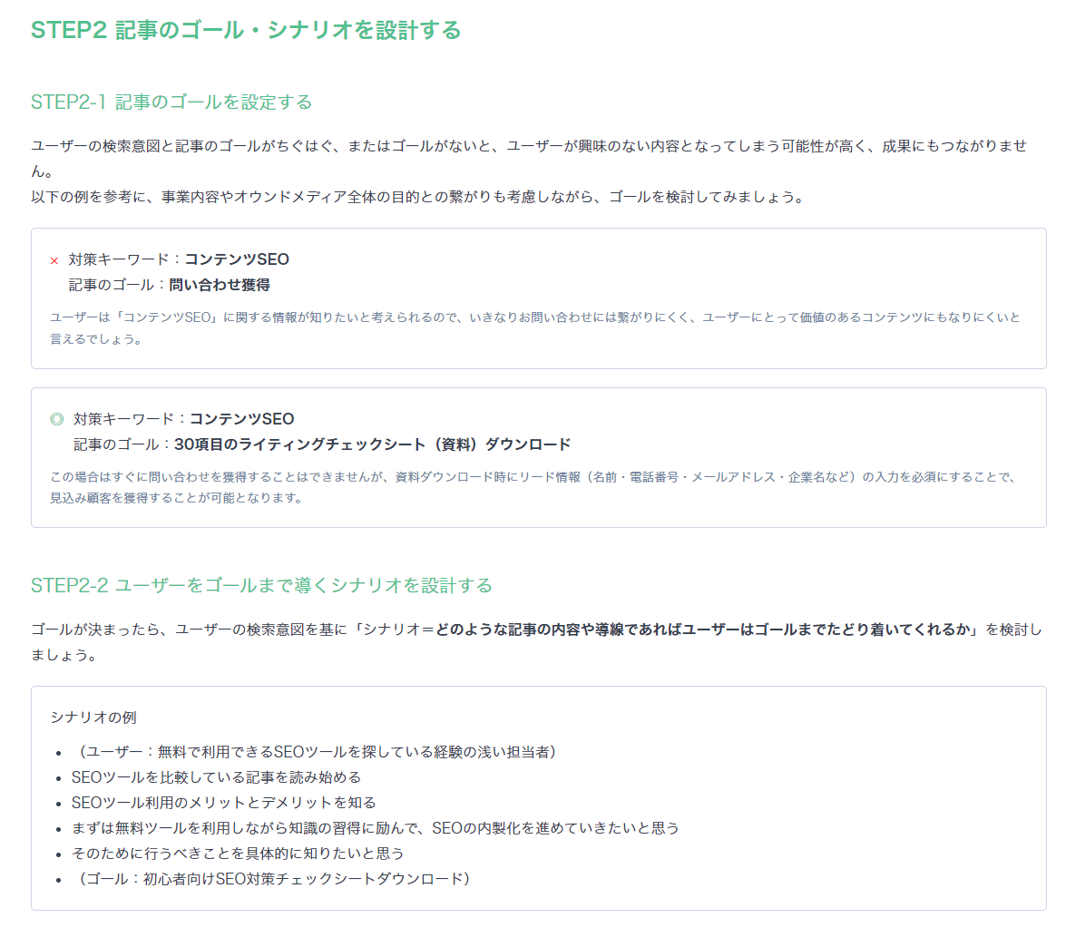▲コンテンツの作成手順を、具体例をもとに解説。SEO型記事のポイントを抑えることが可能