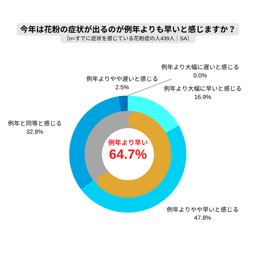 花粉の飛散量が例年より多いと言われている今年、花粉症の人のうち64.7%が例年より症状が出るのが早いと感じ、また47.0%が例年より症状が辛いと感じています。そして半数以上の52.1%の人が今年の花粉を例年より警戒していて、その理由1位は「花粉の飛散量が多そうだから」70.5%ということがわかりました。