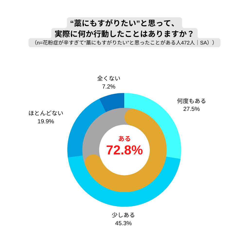 花粉症の人のうち74.1%もの人が、花粉症が辛すぎて“藁にもすがりたい”と思ったことがあると回答しました。その回数は1日平均4.1回で、そのうち実際に“藁にもすがる”ような行動がをとった人は72.8%となりました。どんな行動をとったかについては、「両鼻にティッシュ」「カラオケで熱唱」などのほか、なんと「会社を辞めた」という驚きの“藁すが”行動も見られました。