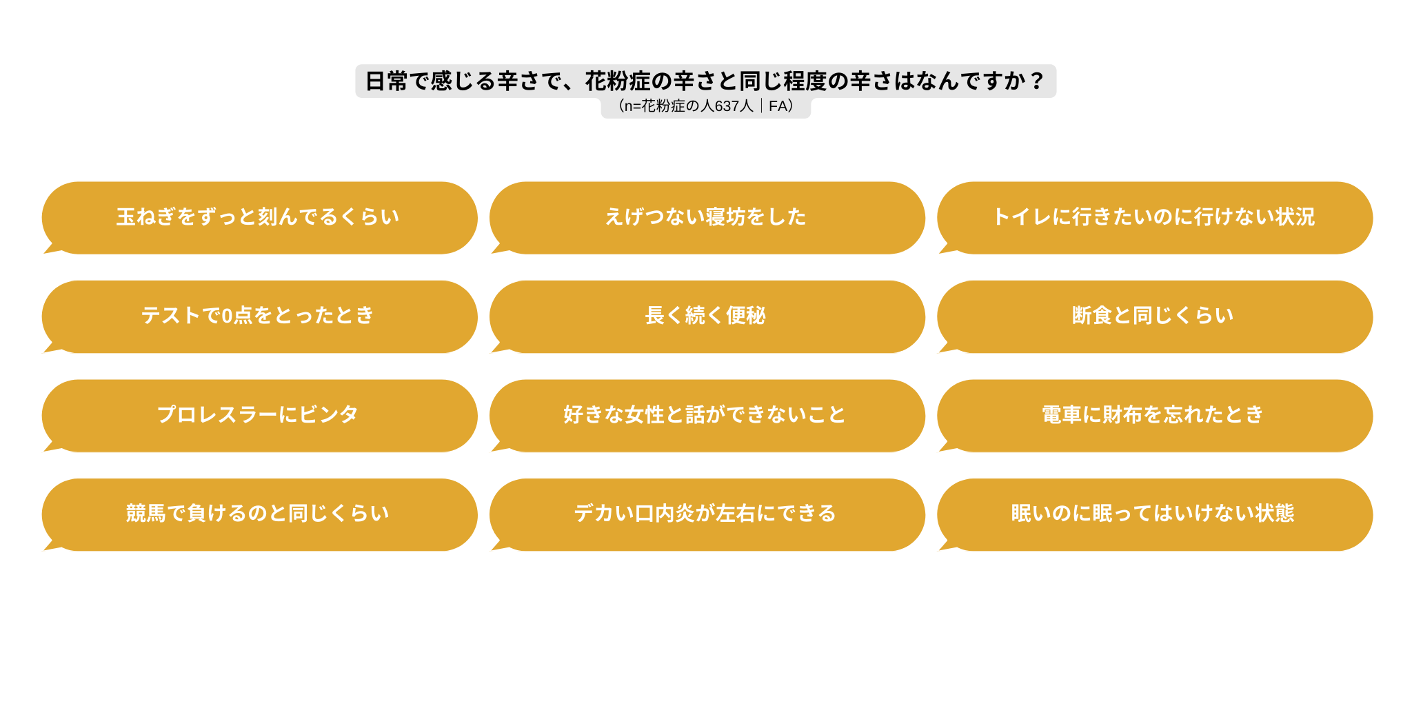 花粉症の辛さと日常生活で感じる辛さに点数を付けてもらってみたところ、「花粉症の辛さ」6.4点、「ひどい風邪にかかった状態」7.3点、「足の小指をタンスの角にぶつけた辛さ」6.9点、「家族や友人と喧嘩して感じる辛さ」6.4点、「上司に怒られて感じる辛さ」6.2点と、“花粉症は上司の叱責より辛い”ということがわかりました。また、花粉症が完治するのであればいくらまで払えるかという質問については、平均27万546円という結果に。サラリーマンの月給の手取り平均額に近い金額を支払ってでも花粉症を完治させたいという切実な想いが見えてきます。さらに、花粉症はどのくらい辛いのか、別の辛さに例えてもらったところ、「玉ねぎをずっと刻んでるくらい」「テストで0点をとったとき」「プロレスラーにビンタ」などさまざまな声が寄せられました。