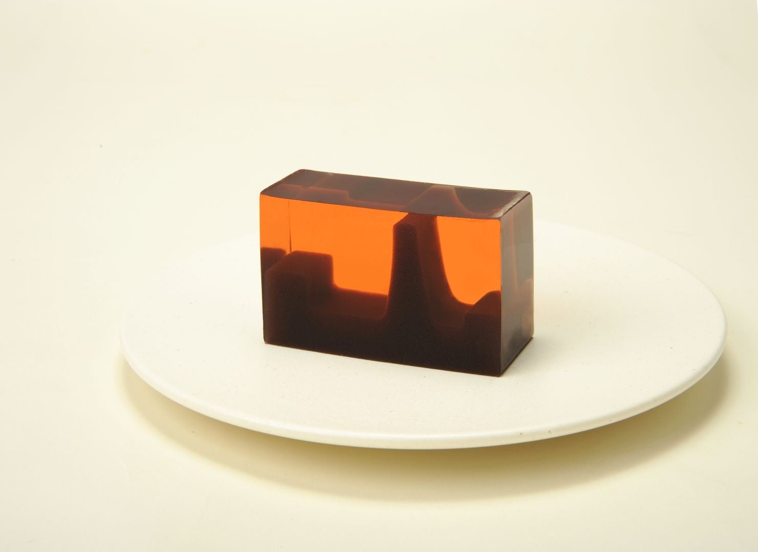 パリの象徴であるエッフェル塔と凱旋門を抽象的に配し、夕暮れの風景を橙の琥珀羹と黒の煉羊羹で表現しました。