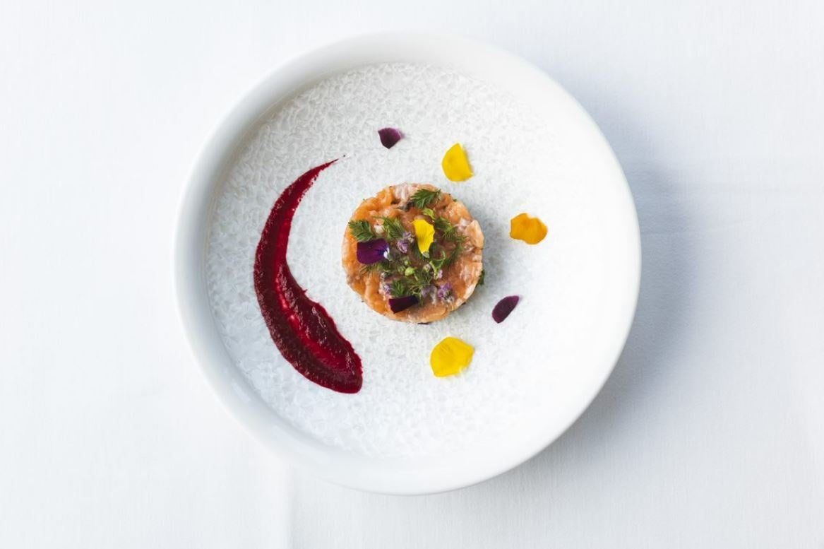 キングサーモンの刺身に、鮮やかな色彩の「ビーツ・チェリー」をベースにした醤油ソースで彩りに華を添えて。