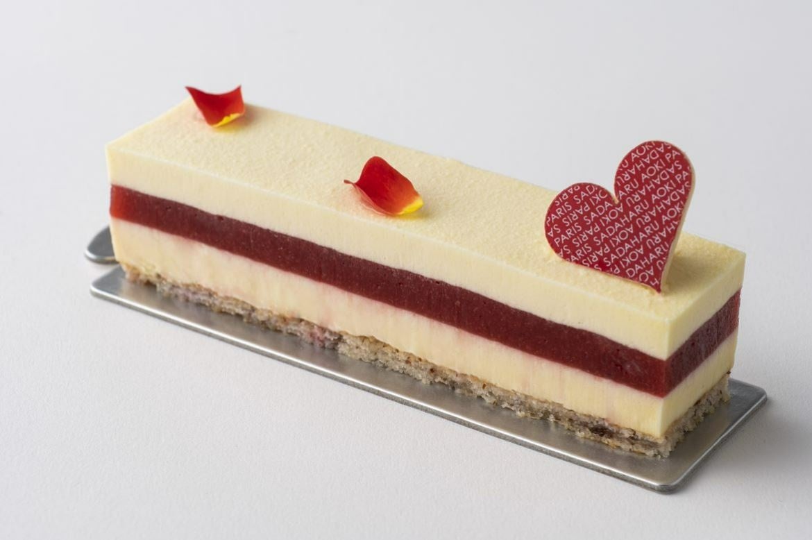 ローズの香りを閉じ込めたクリームとイチゴのコンフィ入りのジュレが織りなす上品で優雅なマリアージュが口に広がる、限定ケーキ。
