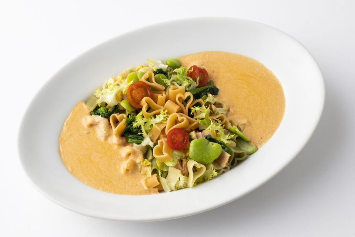 紅ズワイ蟹、そら豆、菜の花をたっぷり使い、春の代名詞であるミモザに見立てたトマトクリームパスタ。
