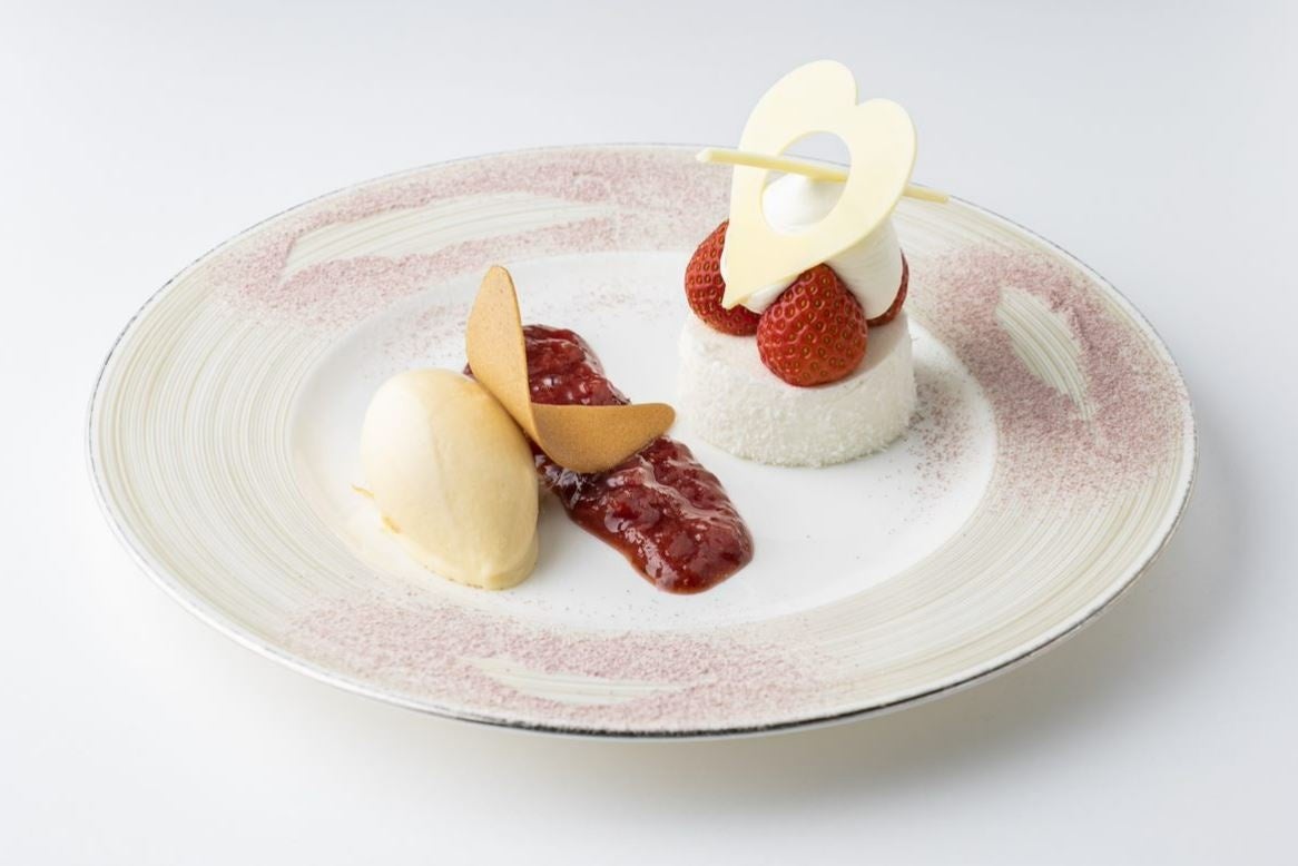 ココナッツムース、ココナッツファイン、イチゴ、アンジェクリームを重ねて、ハートを射る矢をイメージしてデザイン。ココナッツアイスクリームとイチゴソースを添えて。