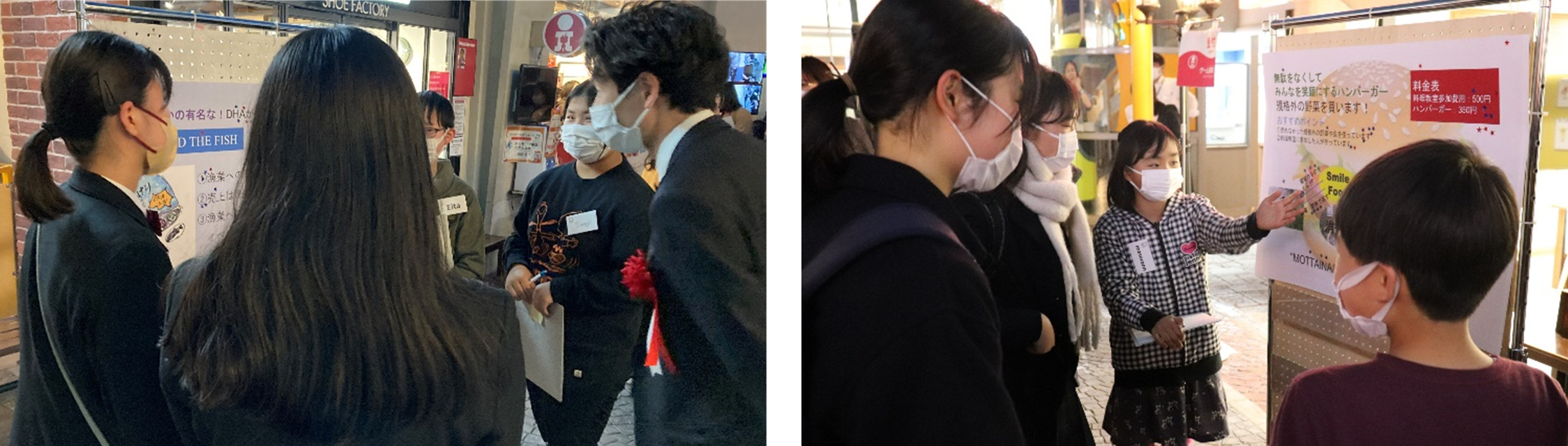 見学が終わった後は、自分たちの発表準備です。「より多くの人に見てもらえるように」や「アピールポイントを言葉で伝えられるように」などに重点を置き作戦会議を行ったのち、各チームでポスターの前に立ち、高校生や日本政策金融公庫の皆様など、会場にいらした多くの方々に向け、緊張しながらも自信を持ってプレゼンテーションを行いました。また、ご講評をいただきながら、投票も実施しました。