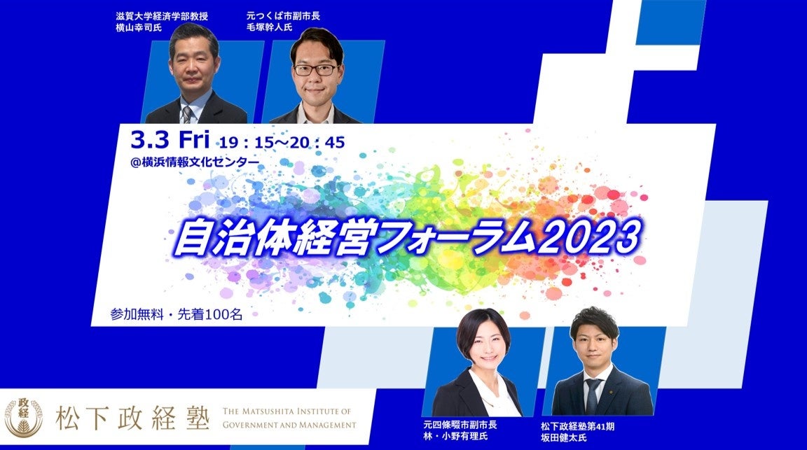 加速度的に進む人口減少に超高齢化社会の到来。社会保障費の増大や公共インフラの老朽化、環境対策など課題山積の地方自治体は、今後どのように舵取りされるべきでしょうか。自治体経営フォーラム2023では、自治体経営の最前線を知る元副市長・大学教授らをお招きし、今後の自治体経営に求められるものや経営ビジョンについて考えていきたいと思います。皆さまのご参加をお待ちしています。